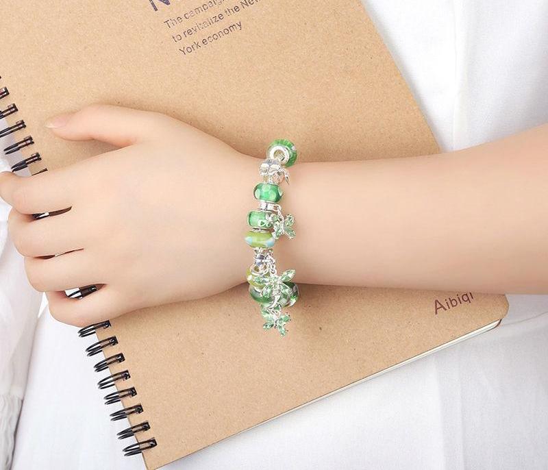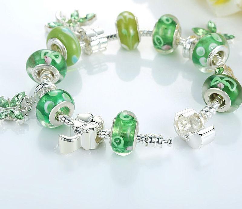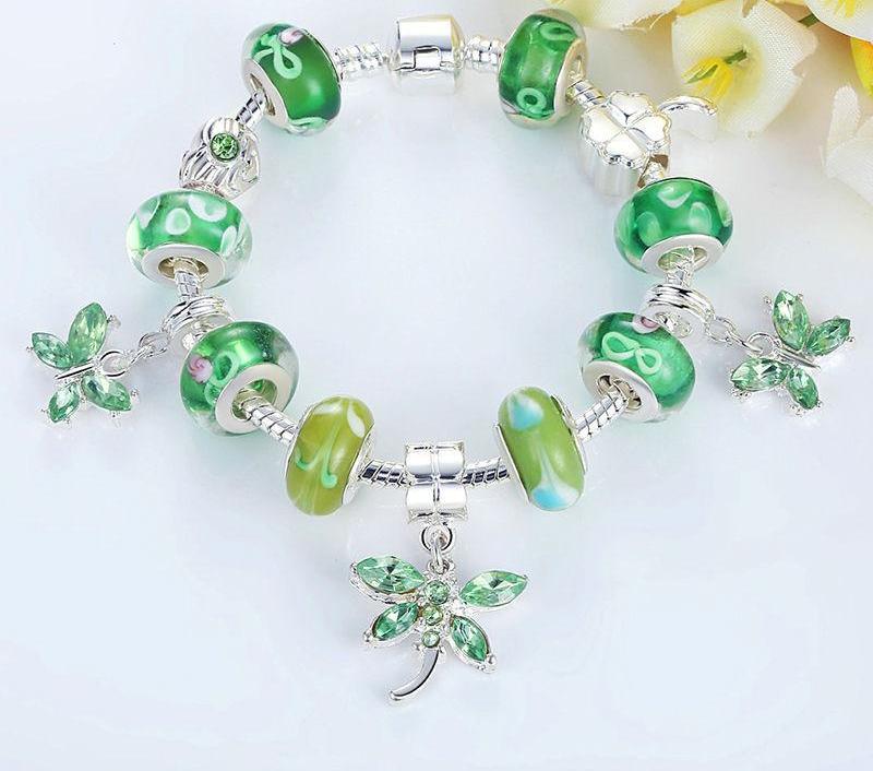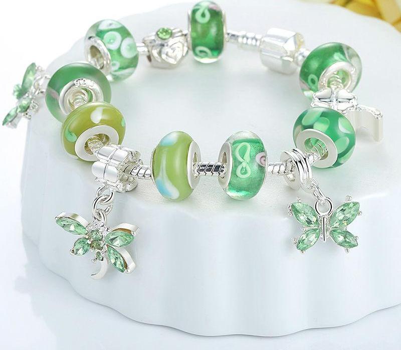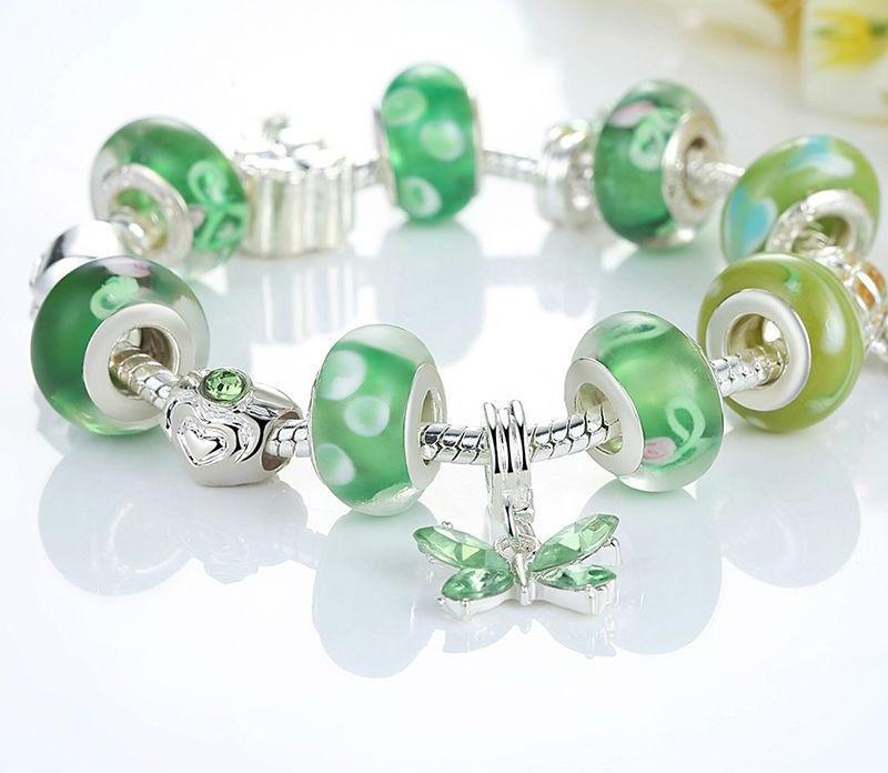 Silver and green butterfly charm bracelet for women, with green glass bead European style. A silver DIY jewelry and can be customized in your own way, you can add some trendy beads on it.