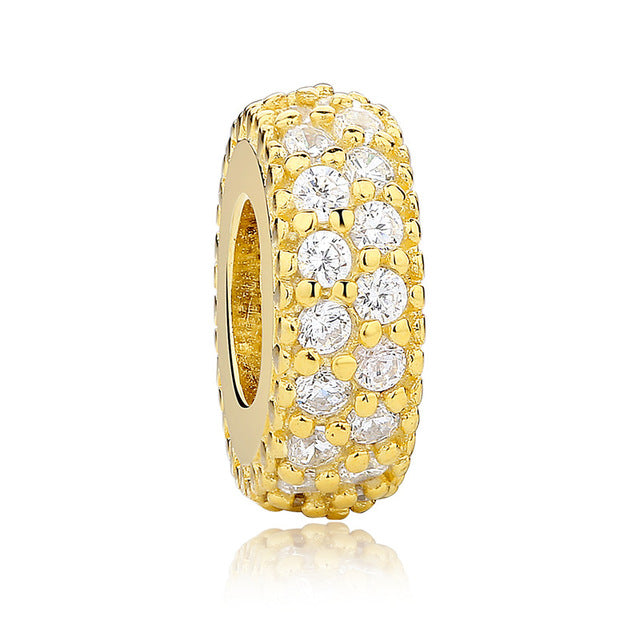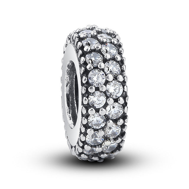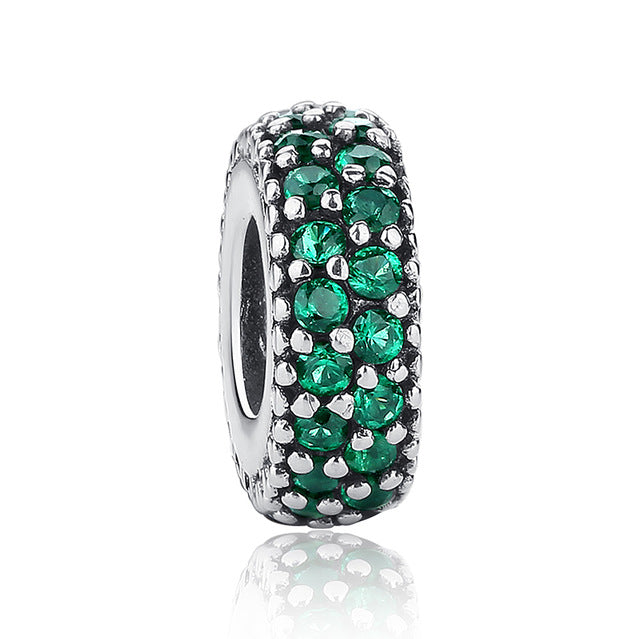 Silver and colored rhinestones inspiration spacer charm ring designed beads. Made from sterling silver and encrusted with dazzling pavé-set clear cubic zirconia, this charm spacer will act as a glitter ball on your bracelet. Wear it with the matching ring for a double dose of glamour.